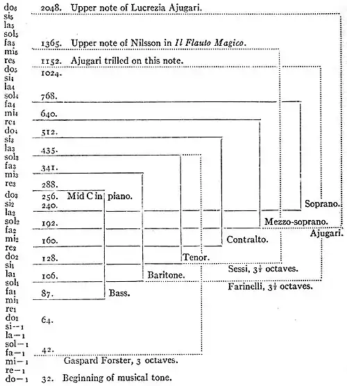 A basso named Gaspard Forster passed from fa−1 to la3; the younger of the sisters Sessi had a contralto voice from do2 to fa5; the voice of Catalani ranged three and a half octaves; a eunuch singer, Farinelli, passed from la1 to re5; Nilsson, in Il Flauto Magico, could take fa5; and Mozart states that he heard in Parma in 1770 a singer, Lucrezia Ajugari, range from sol2 to do6, which she gave purely, whilst she could execute trills on re5. The latter is the most highly pitched voice referred to in musical literature, an octave and a half above the highest ordinary soprano. It will be observed that the lowest note of Gaspard Forster's voice is not much above the pitch at which the perception of musical tone begins, and that from this note to the upper note of Lucrezia Ajugari there is a range of nearly six octaves, whilst the extreme range of ordinary voices, from the lowest bass to the highest soprano, is a little over three octaves. It is also interesting to observe that the range of the human ear for the perception of musical tone is from do−1 to do10, or from about 32 to 32,768 vibrations per second—eleven octaves.