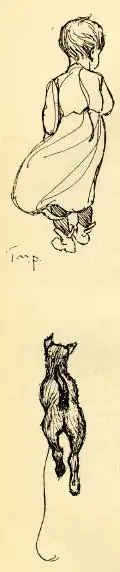 The child sat down on the step and the two had another interview. During it the dog greatly exerted himself to please the child. He performed a few gambols with such abandon that the child suddenly saw him to be a valuable thing. He made a swift, avaricious charge and seized the rope.