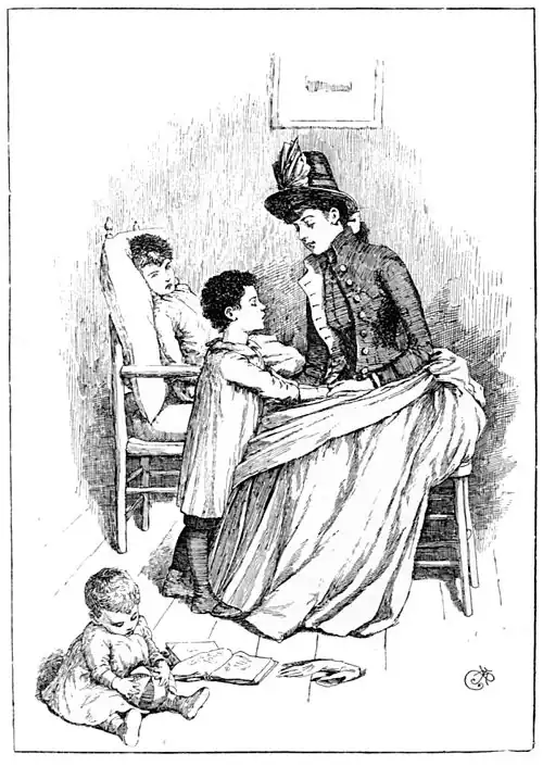 "Of course I put up a little basket of cake and oranges and figs, and while Lotty feasted, we talked. I found that their mother washed dishes all day in a restaurant over by the Albany Station, leaving the three children alone in the room they have on Berry Street. Think of that poor thing going off before light these winter mornings to stand over horrid dishes all day long, and those three scraps of children alone till night Sometimes they had a fire, and when they had n't they stayed in bed. Broken food and four dollars a week was all the woman got, and on that they tried to live. Good Mrs. Grover happened to be nursing a poor soul near Berry Street last summer, and used to see the three little things trailing round the streets with no one to look after them.