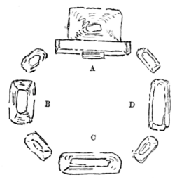 Almost all round the ruined town there are numberless limestone hills between fifty and three hundred feet in height, and at the top of nearly every one of them are foundation-mounds or tumuli. In some cases these foundations are merely outlined in rough stones, in others they are flat oblong mounds, which may have supported buildings of a perishable material. A common arrangement of the remains on these hilltops is given in the accompanying sketch. I opened one set thus arranged. The monnd A had probably supported a small "cue" or shrine; a terrace ran in front of it, which was reached by a short flight of