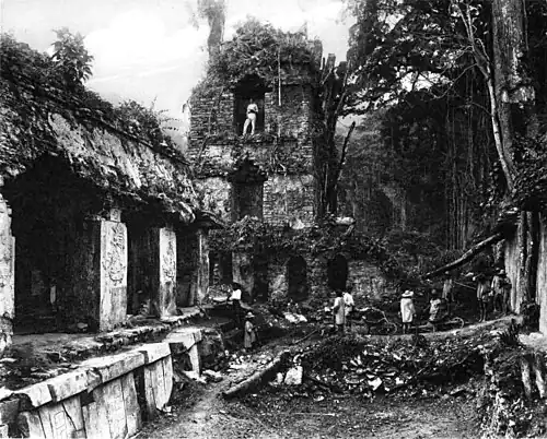 On the 20th February, Gorgonio, José Domingo, and Caralampio Lopez arrived at Palenque, having ridden overland from Guatemala, and we at once set to work making paper moulds of the inscriptions; by the end of three weeks a large number of moulds had been dried and stored in one of the temples, and others in process of making were still adhering to the sculptured slabs, when, late one evening, a heavy rain-storm unexpectedly burst upon us. It was impossible in the dark to reach the temple where the moulds were stored, as the whole of the intervening space was covered with felled trees, and even in the daytime it was a severe gymnastic exercise to get from one building to another. When daylight came and we were able to reach the temple, we found that the waterproof sheets with which the moulds were covered had not sufficed to keep out the driving rain, and that half of the moulds had been reduced to a pulpy mass, and those in process of making had been almost washed away. The rain continued to fall all day long, the rooms where we were living were partly flooded, the walls were running with water, and the drip came through the roof in all directions. It was not until the next day that the remnant of the moulds could be carried out to dry in the returning sunshine, and then we made certain that the greater part of the work would have to be done over again.