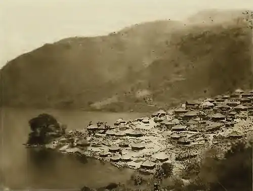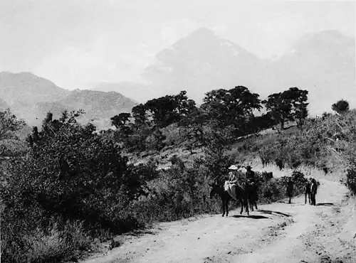 The narrow path zigzagged down the hill, and was so steep that we preferred to dismount and lead our mules until we reached the water's edge; then a ride of a few miles over a path scraped out of the hillside brought us in view of the little Indian town.