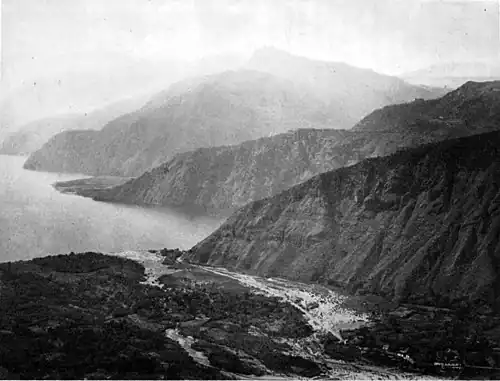 The stream is now somewhat diverted from its bed and is led away through many channels to irrigate the vegetable gardens, orchards, and coffee-plantations which cover the delta. But even with so many outlets there are times during the wet season when the sudden increase in the volume of water threatens the safety of the town, and we were told that not many years ago an inundation caused great damage, washing away some of the houses, and cutting off the townspeople from all outside communication. There is nothing especially interesting in the town itself; but its surroundings of lake and mountain, garden and orchard, are charming, and the bright green of the trees seemed all the more brilliant in contrast with the bareness of the surrounding hills, on which so much of the timber has been ruthlessly destroyed.