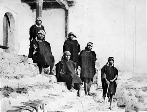 The women of the town are very clean and tidy in their dress, and take especial care of their hair: we saw numbers of them almost standing on their heads in the shallow edge of the lake in their efforts to give their hair a good washing, after which they dried and combed and oiled it and braided it into long tails. It took much coaxing to induce the group of mayores and alguacils on the next page to stand to the camera; however, they at last consented. But when we tried to take a separate portrait of the young man who is