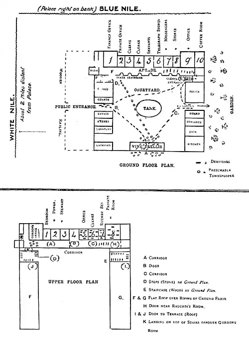 The account which I have given of how Gordon died differs so very little in essentials from the account which I have since received from Khaleel Agha Orphali, and which has been read to Khartoum survivors with the idea of comparing the statements made with what was related at the time, that I think it advisable to allow my account to stand, and to append that of Orphali, giving a few details concerning Orphali himself. I might mention that Gordon was credited with having killed a much greater number of dervishes than I have given, but the error arose from his being credited with the killing of the dervishes on the "Gouvernorat" (E) staircase; but these were killed by the guards. The fact of his having killed so many as he did, is to be accounted for in two ways; first, the people who first assailed him on the private staircase were unaccustomed to the use of the small spears they carried indeed, it is safe to say that they had only been dervishes outwardly for half an hour or so; and, secondly, as they were packed on a narrow staircase, every shot told on the mass. To assist the reader in following Orphali's narrative, I have drawn from memory a rough plan of the palace as I remembered it while it stood intact, and, with the assistance of Fauzi Pasha and others, have been able to name each of the rooms.
