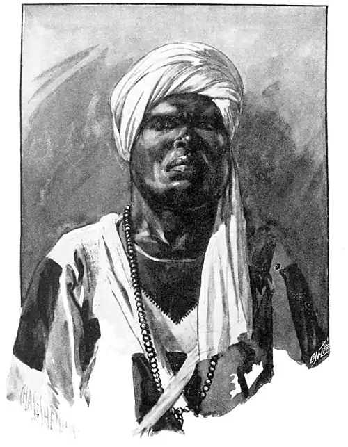 - ↑ The "Ratib" occupied about three-quarters of an hour in recitation, and, by the Mahdi's orders had to be repeated daily by every one after the morning and afternoon prayer; it ranked in importance with the five obligatory daily prayers ordained by the Quoran. It was also looked upon as a sort of talisman, and it was given out, after such fights as "Toski, Ginniss, and the Atbara, that those killed were those who had either not learned the Ratib or had not a copy with them. The book was carried in a small leather case suspended from the neck. A number of copies were printed on the old Government press, but it was considered more meritorious to write out a copy rather than to purchase one, and the Mahdi had hoped that this Ratib would eventually become a sort of Quoran accompanied by its volumes of "traditions," hence his anxiety that every one should learn to write.