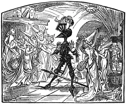 "The Emperor was surprised at this bold proposal, however it appeared the wisest to him; "You are a knave he replied after a moment's consideration, however your advice is good, and displays prudence, as your offense shows adventurous courage. Well then, and gave him the knight-stroke, so I raise you to nobility, who begged for grace for your offence now kneels before me, rise as knight; knavish you have acted, and Knave of Bergen shall you be called henceforth, and gladly the Black knight rose; three cheers were given in honor of the Emperor, and loud cries of joy testified the approbation with which the Queen danced still once with the Knave of Bergen.