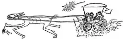 I made a sketch of the turn-out. It is not a Work, it is only what artists call a "study"—a thing to make a finished picture from. This sketch has several blemishes in it; for instance, the wagon is not traveling as fast as the horse is. This is wrong. Again, the person trying to get out of the way is too small; he is out of perspective, as we say. The two upper lines are not the horse's back, they are the reins;—there seems to be a wheel missing—this would be corrected in a finished Work, of course. That thing flying out behind is not a flag, it is a curtain. That other thing up there is the sun, but I didn't get enough distance on it. I do not remember, now, what that thing is that is in front of the man who is running, but I think it is a haystack or a woman.