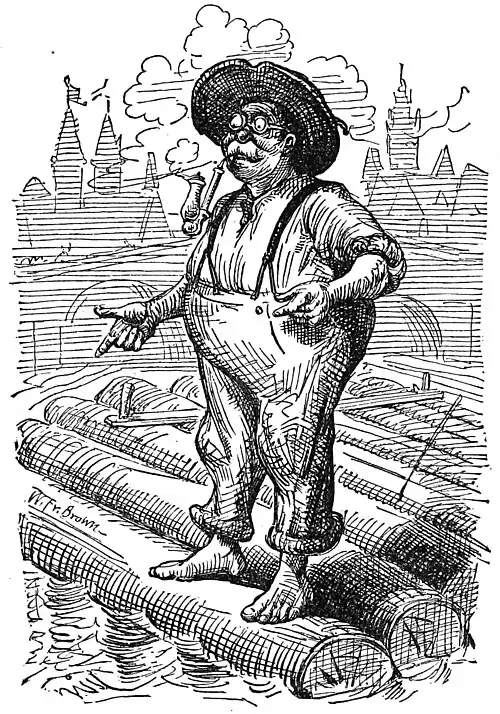 We discharged the carriage at the bridge. The river was full of logs,—long, slender, barkless pine logs,—and we leaned on the rails of the bridge and watched the men put them together into rafts. These rafts were of a shape and construction to suit the crookedness and extreme narrowness of the Neckar. They were from 50 to 100 yards long, and they gradually tapered from a 9-log breadth at their sterns, to a 3-log breadth at their bow-ends. The main part of the steering is done at the bow, with a pole; the 3-log breadth there furnishes room for only the steersman, for these little logs are not larger around than an average young lady's waist. The connections of the several sections of the raft are slack and pliant, so that the raft may be readily bent into any sort of curve required by the shape of the river.