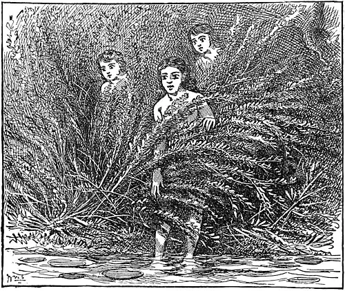 now and then we plunged in and had a swim. Every projecting grassy cape had its joyous group of naked children, the boys to themselves and the girls to themselves, the latter usually in care of some motherly dame who sat in the shade of a tree with her knitting. The little boys swam out to us, sometimes, but the little maids stood knee deep in the water and stopped their splashing and frolicking to inspect the raft with their innocent eyes as it drifted by. Once we turned a corner suddenly and surprised a slender girl of twelve years or upwards, just stepping into the water. She had not time to run, but she did what answered just as well; she promptly drew a lithe young willow bough athwart her white body with one hand, and then contemplated us with a simple and untroubled interest. Thus she stood while we glided by. She was a pretty creature, and she and her willow bough made a very pretty picture, and one which could not offend the modesty of the most fastidious spectator. Her white skin had a low bank of fresh green willows for background and effective contrast,—for she stood against them,—and