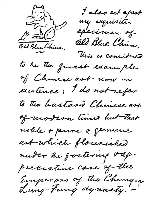 There were Masters in those days, but alas, it is not so now. Of course the main preciousness of this piece lies in its color; it is that old sensuous, pervading, ramifying, interpolating, transboreal blue which is the despair of modern art. The little sketch which I have made of this gem cannot and does not do it justice, since I have been obliged to leave out the color. But I've got the expression though.