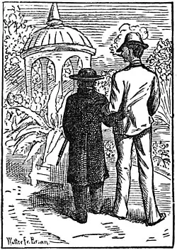 "The side-walk is hardly wide enough for three, so I will walk behind; but keep the talk going, keep the talk going, there's no time to lose, and you may be sure I will do my share." He ranged himself behind us, and straightway that stately snow-white young fellow closed up to the side-walk alongside him, fetched him a cordial slap on the shoulder with his broad palm, and sung out with a hearty cheeriness,—