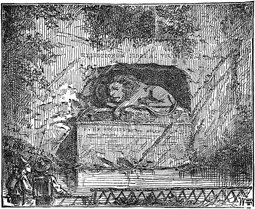 size is colossal, his attitude is noble. His head is bowed, the broken spear is sticking in his shoulder, his protecting paw rests upon the lilies of France. Vines hang down the cliff and wave in the wind, and a clear stream trickles from above and empties into a pond at the base, and in the smooth surface of the pond the lion is mirrored, among the water lilies.