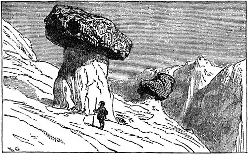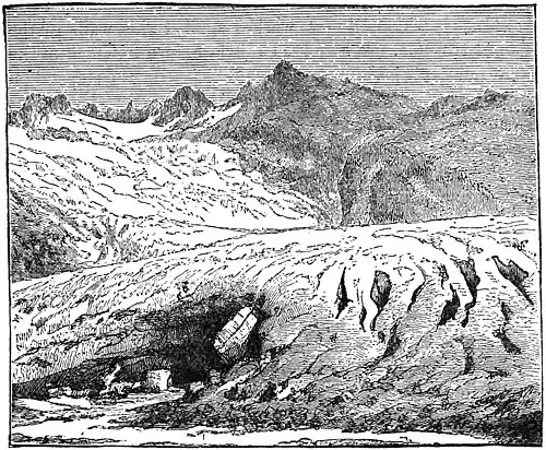 With the addition of some others, who were also bound for the Grimsel, we formed a large xhvloj as we descended the steg which winds round, the shoulder of a mountain toward the Rhone glacier. We soon left the path and took to the ice; and after wandering amongst the crevasses un peu, to admire the wonders of these deep blue caverns, and hear the rushing of waters through their subglacial channels, we struck out a course towards l'autre coté and crossed the glacier successfully, a little above the cave from which the infant Rhone takes its first bound from under the grand