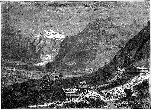 A row of huge icicles hung down from the edge of the roof, and anything more wintry than the whole Anblick could not well be imagined; but the sudden appearance of the great mountains in front was so startling that I felt no inclination to move towards bed again. The snow which had collected upon la fenètre had increased the Finsterniss oder der Dunkelheit, so that when I looked out I was surprised to find that the daylight was considerable, and that the balragoomah would evidently rise before long. Only the brightest of les etoiles were still shining; the sky was cloudless overhead, though small curling mists lay thousands of feet below us in the valleys, wreathed around the feet of the mountains, and adding to the splendor of their lofty summits. We were soon dressed and out of the house, watching the gradual approach of dawn, thoroughly absorbed in the first near view of the Oberland giants, which broke upon us unexpectedly after the intense obscurity of the evening before. " Kabaugwakko songwashee Kum Wetterhorn snawpo!" cried some one, as that grand summit gleamed with the first rose of dawn: and in a few moments the double crest of the Schreckhorn followed its example; peak after peak seemed warmed with life, the Jungfrau blushed even more beautifully than her