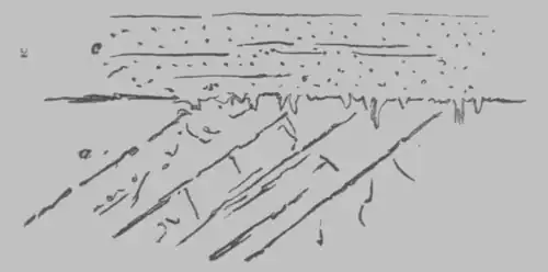 In general the stratified masses of the earth's crust are placed with their surfaces parallel to each other; from which we know that during their accumulation no violent disturbance of the external parts of our planet happened in those regions to confuse the regularity, and alter the horizontal plane of deposition. But in particular instances this conformity of the strata is departed from, and certain (older) rocks appear inclined at various, often steep, angles, or standing even vertical, while the more recent deposits lie level or nearly so, upon them. What renders this case of disturbed stratification more impressive, with respect to the lapse of time, is the occurrence of positive circumstantial proof of the intervention of mechanical, chemical, or vital agencies of considerable duration between the elevation of the older, and the deposition of the newer strata, Thus in diag. No. 1. the inclined beds a of limestone were exposed to watery action, and broken up in part, so that fragments and pebbles of