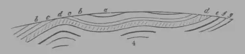 fig. 2. the same inclined limestone beds a are covered by horizontal oolitic strata c; and are worn and polished on the face of junction, and penetrated into holes by boring shells, which lived in the oolitiferous sea, long after the elevation of the older rocks. (1830.)