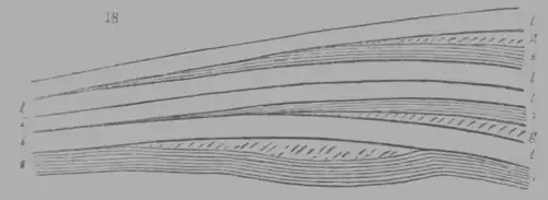 Stratified rocks are either of equal thickness over a large extent of country, or attenuated to a wedge shape in some one direction, or decreasing in thickness every way from a certain point or district, so as to constitute a lenticular formation. Strata of one certain kind of rock, which are, in some places, accumulated into a uniform mass, become divided in other districts, and separated into distinct members by the interposition of wedge-shaped deposits. All these circumstances are represented in the annexed diagram (fig. 18.), where