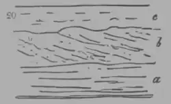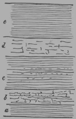 The lamination of rocks offers some interesting facts. Some beds of gritstone (as a) are composed of laminæ parallel to the plane of the beds; such lamination is generally produced by the alternation of mica, whose broad plates cause a partial disunion of the parallel laminæ of quartzose grains. Other beds (as b) are composed of oblique or curved laminæ, a circumstance generally