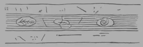 bodies (as a leaf or shell), are frequently included, and sometimes these interrupt the lamination of the shale, as in fig. 21. Such nodules are frequently traversed by plates of calcareous spar, and these receive the name of septaria.
