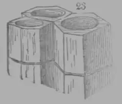 basalt, as seen in Staffa and the Giant's Causeway. This appearance arises from the intersection of planes rectangulated to the surface of the rock, and meeting one another in several directions, so as to insulate polygonal prisms. These prisms are divided across, by concavo-convex surfaces, as fig. 23.