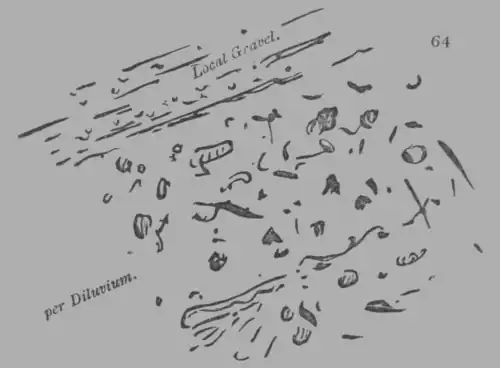 The most singular circumstance attending the accumulation of the proper diluvium is the extreme confusion, and almost total want of laminar or stratified structure, in its mass: pebbles, and fragments of rock, of all sizes, of different nature, and from different regions, lie mixed indiscriminately in clay many yards in thickness; which seems clearly to prove that the whole was rapidly accumulated, and that the particles had not time to be arranged according to magnitude or specific gravity, but were heaped confusedly together by a force of extraordinary intensity and short duration.