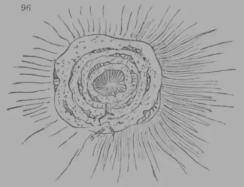 each way from the crater (e). In a horizontal section, the layers of ashes and streams of lava would be distinguished, as in fig. 96.