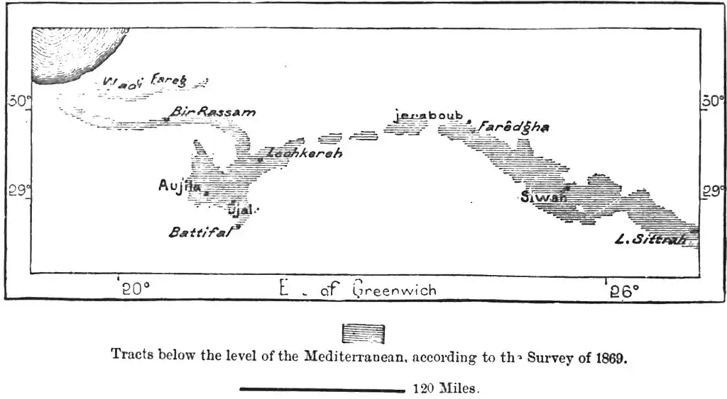 Thus limited southwards by the Wady Fareg, the Bir Rassam, the Wady of the Aujila oases, Gerdoba uud Siwah, the limestone plateau of Cyrenaica and Marmariea would seem to form a large island almost detached from the rest of the continent. There can be no doubt that the whole of this depression of the wadies and oases was formerly flooded with the Mediterranean waters. After their separation from the sea by intervening strips of coastlands, the marine basins gradually evaporated under the fierce sun of Africa. But the waters have left clear traces of their existence in the banks of recent shells, the deposits of salt, gypsum, saltpetre, magnesia, and numerous "bitter lakes." Thus from one extremity to the other of the Gulf of Sidra, there is an exact parallelism in the