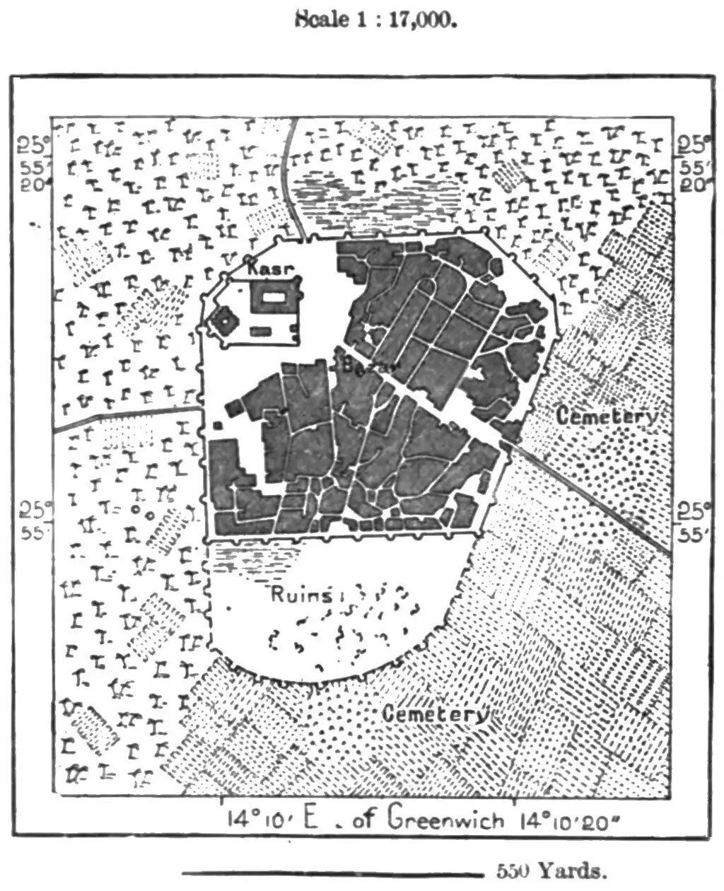 Gatron lies at the northern extremity of a chain of oases which stretches as far as Tejerri, the last inhabited place in Fezzan, on the verge of the desert. Here also are seen the last date-palms, and the first dum-palms in the direction of the Sahara. Rohlfs was unable to determine the slope of the wady, which is perhaps nothing more than a depression in an old lacustrine basin.