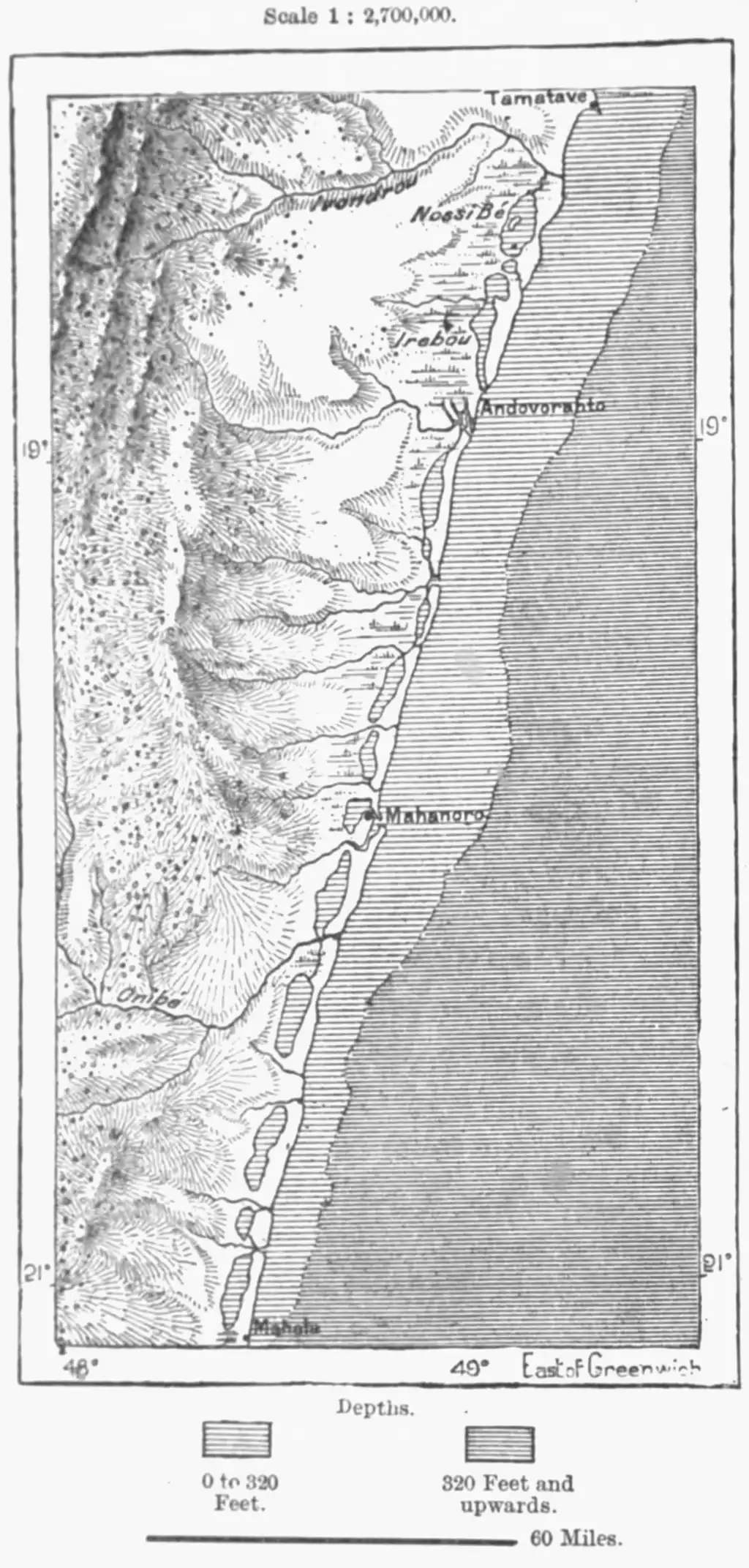 The outer line separating these lagoons from the ocean consists in many places of coral reefs covered by the action of the waves with sands and shells, and thus gradually transformed to a continuous dyke or embankment, which presents an effectual barrier against the encroachments of the sea. Forest trees have here struck root, affording a grateful shade to the numerous villages following continuously along the beach. Under the action of the marine current, which here flows close in-shore, the coastline has acquired a surprisingly regular form. From the inlet of Fort Dauphin, at the south-east corner of the island, for a distance of 540 miles northwards to Marofototra, the seaboard is almost perfectly rectilinear, and vessels frequenting these waters usually keep well off the coast in order to avoid the neighbouring reefs