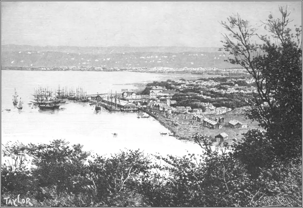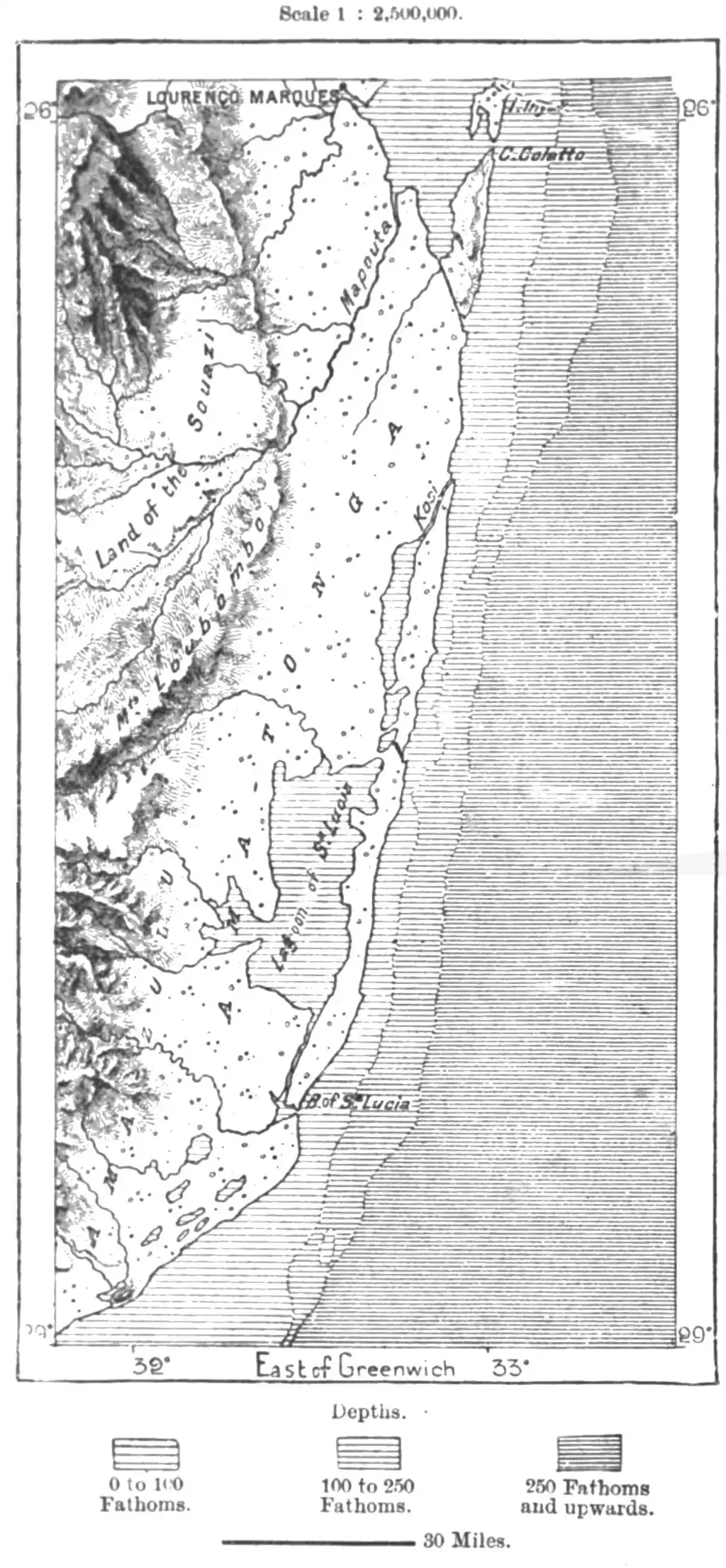 The southern district between the Um-Tavuna and Um-Zimkulu rivers is one of the most thinly peopled in Natal, and here the white squatters are still scattered in small and isolated groups amid the surrounding Zulu and Pondo populations. In this district has recently been founded the Norwegian agricultural settlement of Marburg. It lies within six miles of the little port of Shepstone, which is formed by the estuary of the Um-Zimkulu, but which is often almost inaccessible to shipping. Other so-called "ports," carefully avoided, however, by skippers, follow northwards along this exposed seaboard, which runs in nearly a straight line from the Kafirland frontier to the capital. Such are Port Harding at the mouth of the Um-Zumbi, and Port Scott in the Um-Pambynioni estuary. But the only pare of the whole coast which is sufficiently indented to offer a large basin to shipping is the inlet of Port Natal, sighted by Vasco de Gama in the yest 1497. At ea point a ridge of rocks with an average height of 200 feet, then, parallel with tho original coastline and afterwards connected by upheaval with the mainland,