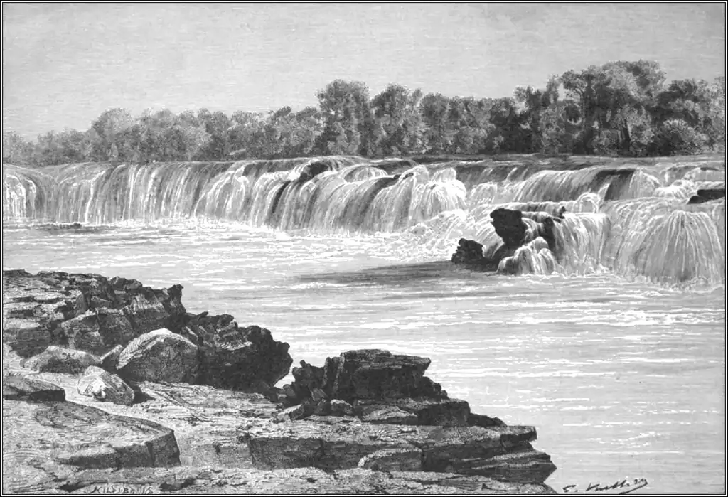 ing, " Smoking caldron." the columns of vapour, appropriately called 'smoke,' rising at a distance of five or six miles, exactly as when large tracts of grass are burned in Africa. Five columns now arose, and bending in the direction of the wind, they seemed placed against a low ridge covered with trees; the tops of the columns, at this distance, appeared to mingle with the clouds. They were white below, and higher up became dark, so as to simulate smoke very closely. The whole scene was extremely beautiful; the banks and islands dotted over the river are adorned with sylvan
