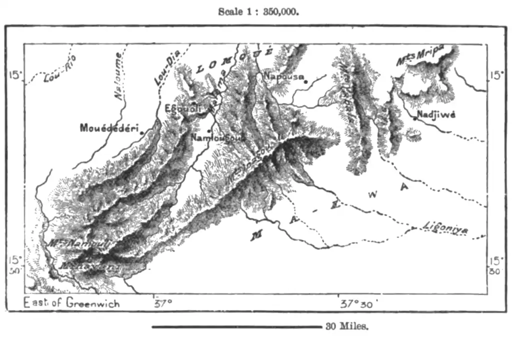 West of the Namuli Mountains, the uplands have been partly denuded by the erosive action of running waters. Nevertheless here also occur some groups of lofty hills, such as the Milanji Mountains, which rise to the south-east of Blantyre and to the south of the Lake Shirwa depression. In the southern part of this region the extensive plains extending in the direction of the Zambese are dotted over with isolated eminences, such es Mounts Shiperoni and Kanga, which are visible for a great distance round about. In the northern districts the heights rise but little above the level of the plateau, or from 350 to about 1,200 or 1,300 feet, yet they present such steep escarpments that they are not easily sealed. The peninsular tract enclosed between the Rovuma and its Lujenda affluent in the extreme north is relieved only by the lateral ridges of the Nyassa coast range from the generally monotonous and dreary aspect of the open plateau country.
