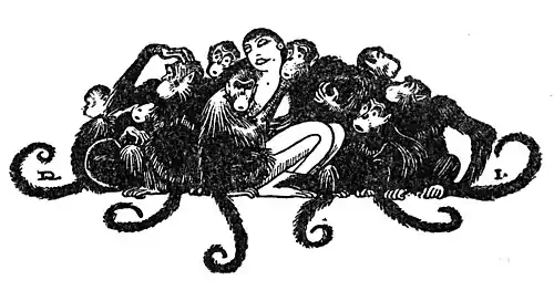 The Manicured Mozambiques had already grown very fond of Angie, and when she arrived, so picturesque in mud and blushes, they did their best to make her feel at home. The leader, an elderly ape, placed in her chair a nice, comfortable cushion—it was of fly paper with the soft side up—and the trombone hospitably offered her a peanut.