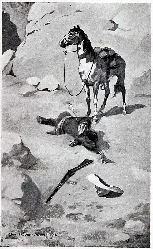 Now Alden Payne would not have had a tithe of the sense with which we have credited him all along, if he had forgotten for one moment the peril which he faced from the moment he came up with the inanimate form of Dick Lightfoot. The turning back of Jethro Alix, and the shift from one saddle to the other had taken only two or three minutes. In the mean time, if there was any danger of thoughtlessness, it was removed by the sight of that feathered shaft protruding from the back of the poor fellow who lay on the flinty earth.