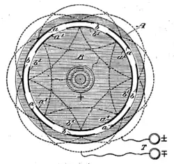 When the cylinder B with the charged coatings is rotated, a circuit connected to the terminals T is traversed by alternating currents. Another form of apparatus is illustrated in Fig. 2. In this apparatus the two sets of tin-foil coatings are glued on a plate of ebonite, and a similar plate which is rotated, and the coatings of which are charged as in Fig. 1, is provided.