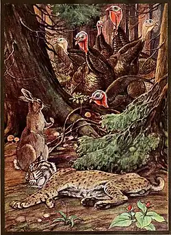 So the Rabbit started the song again, and the Turkeys began to dance around the Wildcat. When they had gone around several times, the Rabbit said: "Now go up and hit him, as we do in the war dance." So the Turkeys, thinking the Wildcat was surely dead, crowded in close around him, and the old Gobbler kicked him. Then the Rabbit drummed his hardest and sang his loudest, "Pick out the Gobbler, pick out the Gobbler," and the Wildcat jumped up and caught the Gobbler.