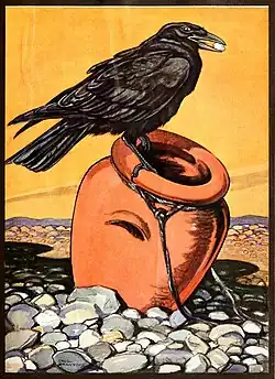 A THIRSTY Crow found a large Water Jar, with only a little water remaining at the bottom. For some time she tried in vain to tip the Jar and pour out the water on the ground, so that she might slake her thirst. But when she found that she was only wasting her efforts, exasperation sharpened her wits. By dropping pebbles into the Jar, she gradually raised the level of the water to the brim, and was then able to drink at pleasure.