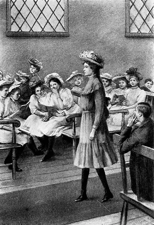 When she reached Mrs. Lynde’s house she found that lady gone. Nothing daunted Anne proceeded onward to the church alone. In the porch she found a crowd of little girls, all more or less gaily attired in whites and blues and pinks, and all staring with curious eyes at this stranger in their midst, with her extraordinary head adornment. Avonlea little girls had already heard queer stories about Anne; Mrs. Lynde said she had an awful temper; Jerry Buote, the hired boy at Green Gables, said she talked all the time to herself or to the trees and flowers like a crazy girl. They looked at her and whispered to each other behind their quarterlies. Nobody made any friendly advances, then or later on when the opening exercises were over and Anne found herself in Miss Rogerson’s class.