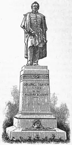 THAYER, Sylvanus, soldier, b. in Braintree, Mass., 9 June, 1785; d. in South Braintree, Mass., 7 Sept., 1872. He was graduated at Dartmouth in 1807, at the U. S. military academy in 1808, and assigned to the corps of engineers. During the next four years he was employed on engineer service on the eastern coast, and as instructor of mathematics at the academy, receiving promotion as 1st lieutenant, 1 July, 1812. Being called to the field in the latter year, he served as chief engineer under Gen. Henry Dearborn, on the Niagara frontier; in 1813 under Gen. Wade Hampton's division on Lake Champlain, receiving promotion to captain of engineers, 13 Oct., 1813, and in 1814 under Gen. Moses Porter's forces in defence of Norfolk, Va., being brevetted major, 20 Feb., 1815, for distinguished services. In 1815 he was sent to Europe to examine military works and schools, and study the operations of the allied armies before Paris, but he was recalled in 1817 to the superintendency of the academy at West Point, which he assumed on 28 July of that year, and held till his resignation, 1 July, 1833. During the sixteen years of his administration he organized the school on its present basis, and raised it from an elementary condition to the same grade with the best military schools in the world. During his term of office he was brevetted lieutenant-colonel, 3 March, 1823, made major, 24 May, 1828, and brevetted colonel, 3 March, 1833. Five years after his resignation he was again offered the charge of the academy, with almost absolute control, but he did not accept. On leaving West Point he was made a member of the board of engineers, of which he was president from 7 Dec., 1838, and for thirty years following he was engaged in the construction of defences in and about Boston harbor, which are models of his engineering skill and standards of economy and stability of construction. On 7 July, 1838, he was made lieutenant-colonel of engineers, and he became colonel, 3 March, 1863. On 1 June, 1863, he was retired from active service, after receiving the brevet of brigadier-general the day before. The degree of A. M. was conferred on him by Dartmouth in 1810, and by Harvard in 1825, and that of LL. D. by St. John's college, Md., in 1830, by Kenyon and Dartmouth in 1846, and by Harvard in 1857. He was also a member of various scientific associations. Gen. Thayer gave about $300,000 for the endowment of an academy, and $32,000 for a free library, at Braintree, and $70,000 for a school of architecture and civil engineering at Dartmouth. His body was reinterred at West Point, 8 Nov., 1877, and his statue was unveiled there, 11 June, 1883, Gen. George W. Cullum making the presentation. It bears the inscription. “Colonel Thayer, Father of the United States Military Academy,” and is represented in the accompanying illustration. A fine full-length portrait by Robert W. Weir is in the library at West Point. He was the author of “Papers on Practical Engineering” (1844). — His cousin, Martin Russell, jurist, b. in Petersburg, Va., 27 Jan., 1819, was graduated at the University of Pennsylvania in 1840, admitted to the Philadelphia bar in 1842, and began to practise in that city. In 1862-'7 he sat in congress, having been elected as a Republican, serving in the committee on the bankrupt law and as chairman of the committee on private land claims. In 1862 he was appointed a commissioner to revise the revenue laws of Pennsylvania, and in 1867, declining re-election to congress, he was appointed one of the judges of the district court of the county of Philadelphia, and he has recently been re-elected. In 1873 he was appointed on the board of visitors to West Point, and wrote the report. In the succeeding year he became president-judge of the court of common pleas of Philadelphia. He is the author of “The Duties of Citizenship” (Philadelphia, 1862); “The Great Victory: its Cost and Value” (1865); “The Law considered as a Progressive Science” (1870); “On Libraries” (1871); “The Life and Works of Francis Lieber” (1873); and “The Battle of Germantown” (1878).