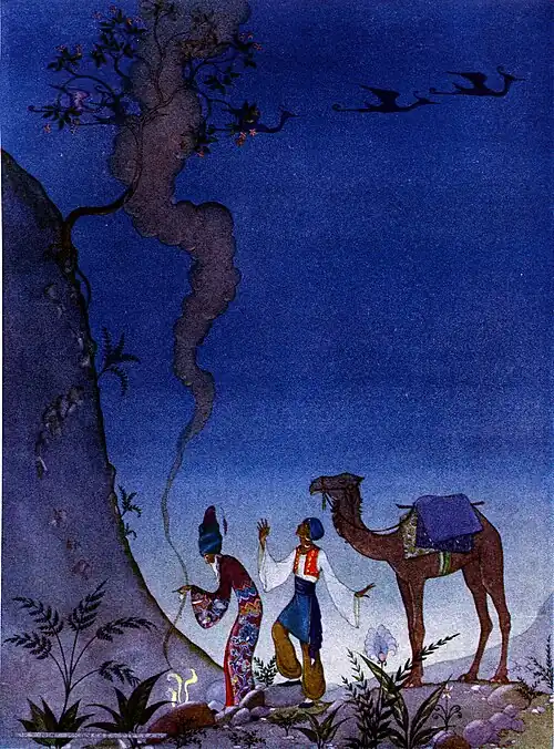 When we came into the valley between these two mountains, the dervish bade me stop the camels. He proceeded to gather some sticks and light a fire: he then cast some incense into it, pronouncing certain words which I did not understand and presently a thick cloud arose. This soon dispersed, when the rock worming the side of the valley opened, and exposed to view a magnificent palace in the hollow of the mountain.