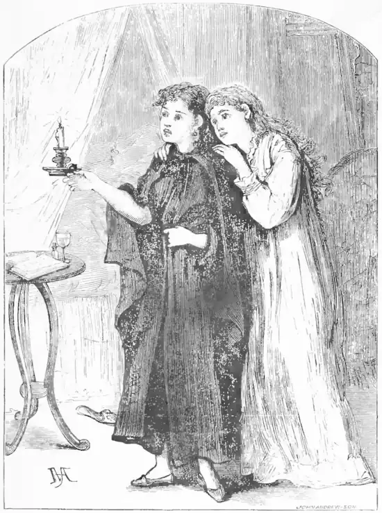 "Let's see what it is;" and, lighting a candle, the fair Amazons looked boldly about.—Page 113.