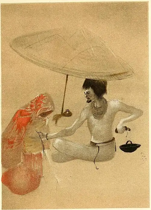 At length, on an auspicious day, a Sanyasi met the Ranis at their bathing ghat, and gave the Rani-in-chief, or the Burra Rani, a certain root, telling her that on returning home she must make a paste of it. She was then instructed to dissolve the paste in water, and having prepared the mixture, to drink a portion of it herself, distributing the remainder among the other Ranis. This, the Sanyasi said, would of a certainty change their barrenness into the blessed state of motherhood.