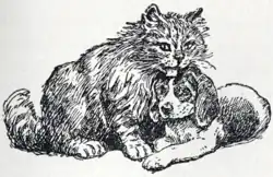 There was one member of the Browning family that Bing at once made friends with, and that was the Professor, a large buff-colored Angora cat. The Professor was so full of love and friendship for everybody that he at once took the little dog under his special care and, in a very few hours, the two were the best of friends. They would sleep together in the same chair, and the Professor tried to wash Bing's face that first evening, just as though he had been another cat.