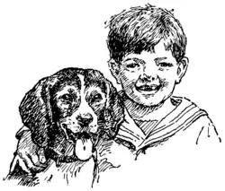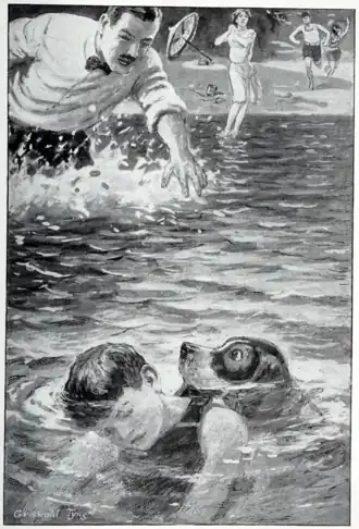 Meanwhile, faithful little Bing was treading water just above the spot where he had last seen his small master. Twice during his swim to the spot he had seen the small head appear just above the water, and he now waited to see if it came in sight again. A full minute he waited, treading water, but no small boy appeared, though he thought he could see him lying on the bottom just beneath the spot where he was swimming. I have never heard of a dog's diving, but in some incredulous manner Bing accomplished the feat. The water was not over three or four feet deep and, in some way best known to himself, he managed to reach his little master and to fasten his teeth in his bathing-suit. A second later he struggled to the surface and began painfully towing his heavy load towards the shore.