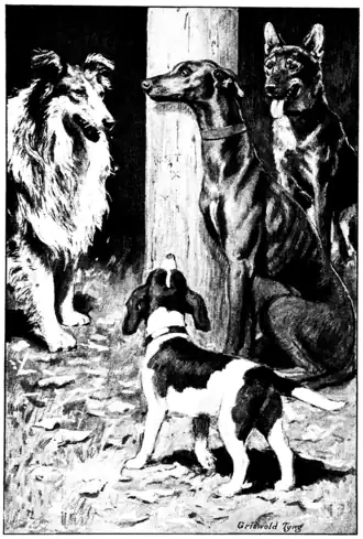 Lastly, little Bing greeted the stranger. As soon as his nose touched that of the greyhound, he began to whimper and tremble and, after a very few seconds, he, likewise, retired and added his voice to the mournful duet that had preceded him. The old greyhound did not howl, he was too spent for that, but he stood looking mournfully at the other dogs with sad, half-closed eyes.