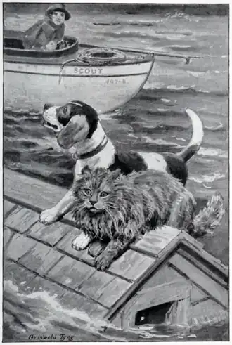 They fidgeted about on the roof for several minutes and finally Bing turned to go back to the piazza, but, to his surprise, there was a broad gap between the end of the plank and the hen-house roof. Then it was that he noticed that the hen-house was moving, not rapidly but steadily, and this movement soon carried them out into the orchard where the strong current took this clumsy craft and, in another minute, the little hound and the big yellow cat had started on their perilous journey towards Long Island Sound.