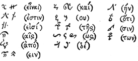 Abbreviations.—In Greek handwriting two sorts of abbreviations are to be distinguished. (1) Those of religious Manuscripts are the most ancient, being found in uncial Manuscripts and transmitted by tradition to the minuscule. The abbreviation is effected by the suppression of vowels and indicated by a bar, The nouns thus abbreviated were those having a religious character.