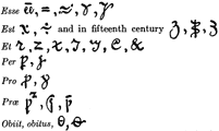 for ur, os, us, and in the North of France all terminations in s and, exceptionally, in et. The origin of this sign is a Tironian note; it arises from the joining of u with s. The following are abbreviations of the verb esse and others of the most widely used signs: