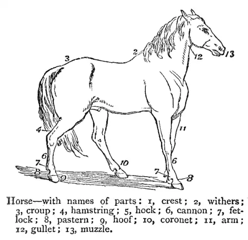 Horse, hors, n. a well-known quadruped: (collectively) cavalry: that by which something is supported, as 'clothes-horse,' &c.: a wooden frame on which soldiers were formerly made to ride as a punishment—also Timber-mare: a boy's crib, a translation.—v.t. to mount on a horse: to provide with a horse: to sit astride: to carry on the back: to urge at work tyrannically: to construe by means of a crib.—v.i. to get on horseback: to charge for work before it is done.—ns. Horse′-artill′ery, field artillery with comparatively light guns and the gunners mounted; Horse′back, the back of a horse; Horse′-bean, a large bean given to horses; Horse′-block, a block or stage by which to mount or dismount from a horse; Horse′-boat, a boat for carrying horses, or one towed by a horse; Horse′-box, a railway car for transporting horses in, or a stall on shipboard; Horse′-boy, a stable-boy; Horse′-break′er, Horse′-tam′er, one whose business is to break or tame horses, or to teach them to draw or carry (Pretty horse-breaker, a woman with little virtue to lose); Horse′-car, a car drawn by horses; Horse′-chest′nut, a large variety of chestnut, prob. so called from its coarseness contrasted with the edible chestnut: the tree that produces it (see Chestnut); Horse′-cloth, a cloth for covering a horse; Horse′-coup′er (Scot.), a horse-dealer; Horse′-deal′er, one who deals in horses; Horse′-doc′tor, a veterinary surgeon; Horse′-drench, a dose of physic for a horse.—adj. Horse′-faced, having a long face.—ns. Horse′-flesh, the flesh of a horse: horses collectively: a Bahama mahogany.—adj. of reddish-bronze colour.—ns. Horse′-fly, a large fly that stings horses; Horse′-foot, the colt's foot; Horse′-god′mother, a fat clumsy woman.—n.pl. Horse′-guards, horse-soldiers employed as guards: the 3d heavy cavalry regiment of the British army, forming part of the household troops: the War Office, or public office in Whitehall, London, appropriated to the departments of the commander-in-chief of the British army.—ns. Horse′-hair, the hair of horses: haircloth; Horse′-hoe, a hoe drawn by horses; Horse′-knack′er, one who buys worn-out horses for slaughtering; Horse′-lat′itudes, a part of the North Atlantic Ocean noted for long calms, so called from the frequent necessity of throwing part of a cargo of horses overboard from want of water when becalmed; Horse′-laugh, a harsh, boisterous laugh; Horse′-leech, a large species of leech, so named from its fastening on horses when wading in the water: a bloodsucker (Prov. xxx. 15); Horse′-litt′er, a litter or bed borne between two horses; Horse′-mack′erel, one of various fishes—the scad (q.v.), &c.; Horse′man, a rider on horseback: a mounted soldier; Horse′manship, the art of riding, and of training and managing horses; Horse′-ma′rine, a person quite out of his element: an imaginary being for whom wild flights of imagination had best be reserved ('Tell it to the horse-marines'); Horse-mill, a mill turned by horses; Horse′-mill′iner, one who provides the trappings for horses; Horse′-mint, a common European wild-mint: the American Monarda punctata—Sweet horse-mint, the common dittany; Horse′-nail, a nail for fastening a horse-shoe to the hoof; Horse′-pis′tol, a large pistol carried in a holster; Horse′-play, rough, boisterous play; Horse′-pond, a pond for watering horses at; Horse′-pow′er, the power a horse can exert, or its equivalent=that required to raise 33,000 lb. avoirdupois one foot per minute: a standard for estimating the power of steam-engines; Horse′-race, a race by horses; Horse′-rac′ing, the practice of racing or running horses in matches; Horse′-rad′ish, a plant with a pungent root, used in medicine and as a condiment; Horse′-rake, a rake drawn by horses; Horse′-rid′ing, a circus; Horse′-sense, plain robust sense; Horse′-shoe, a shoe for horses, consisting of a curved piece of iron.—adj. shaped like a horse-shoe.—ns. Horse′-sol′dier, a cavalry soldier; Horse′-tail, a genus of leafless plants with hollow rush-like stems, so called from their likeness to a horse's tail; Horse′-train′er, one who trains horses for racing, &c.; Horse′-way, a road by which a horse may pass; Horse′-whip, a whip for driving horses.—v.t. to strike with a horse-whip: to lash.—ns. Horse′woman, a woman who rides on horseback; Hors′iness; Hors′ing, birching a schoolboy mounted on another's back.—adj. Hors′y, of or pertaining to horses: devoted to horse racing or breeding.—A dark horse (see Dark); Flog a dead horse, to try to work up excitement about a threadbare subject; Get on, Mount, the high horse, to assume consequential airs; Put the cart before the horse (see Cart); Ride the wooden horse (see above); Take horse, to mount on horseback. [A.S. hors; Ice. horss, Old High Ger. hros (Ger. ross).]